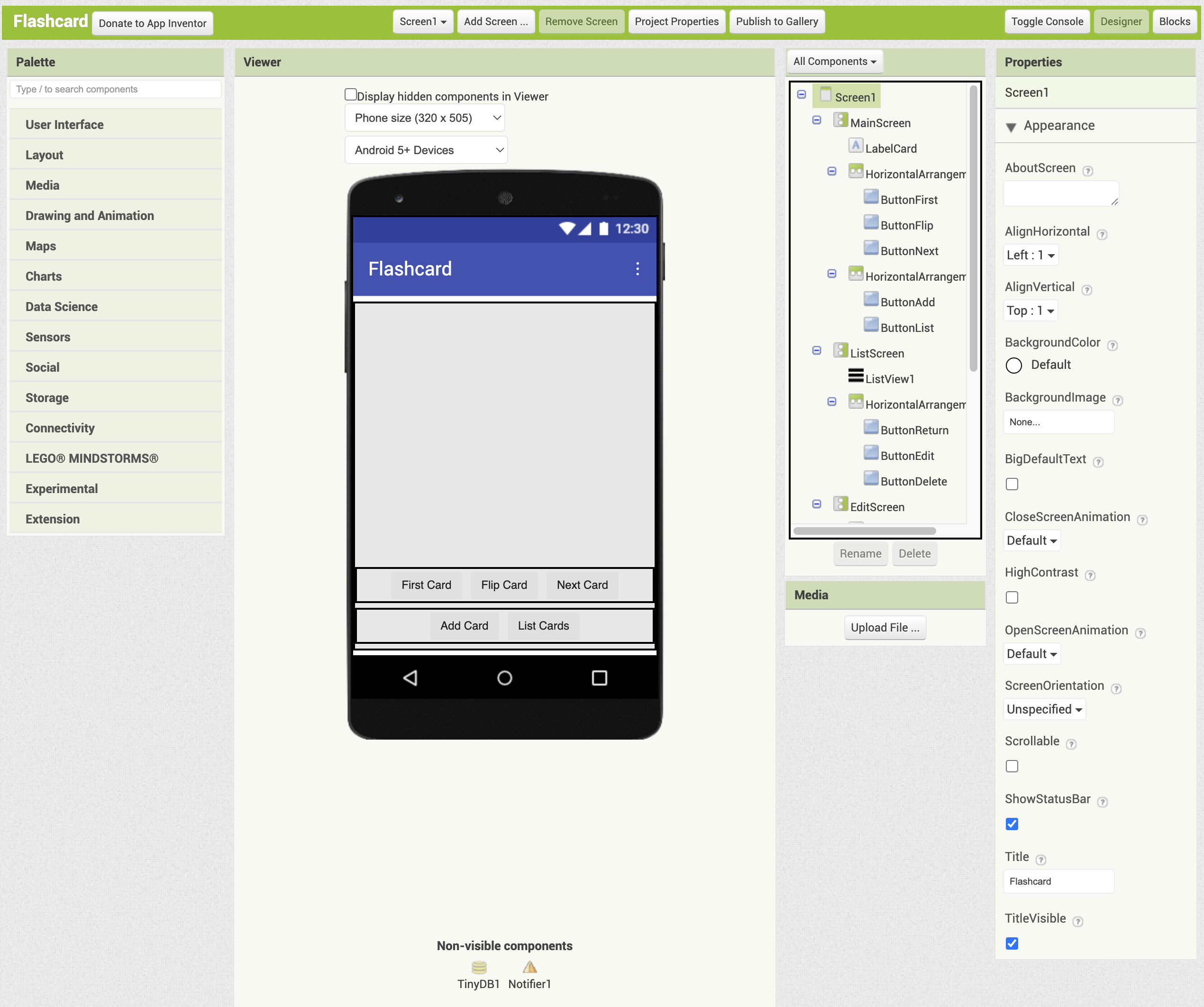 This app uses three screens, but setting the same global variables for each screen and reusing the same components, such as a TinyDB, on every screen would be cumbersome. So instead, it uses a virtual screen technique, where only Screen1 is used and the three screens are switched within it.