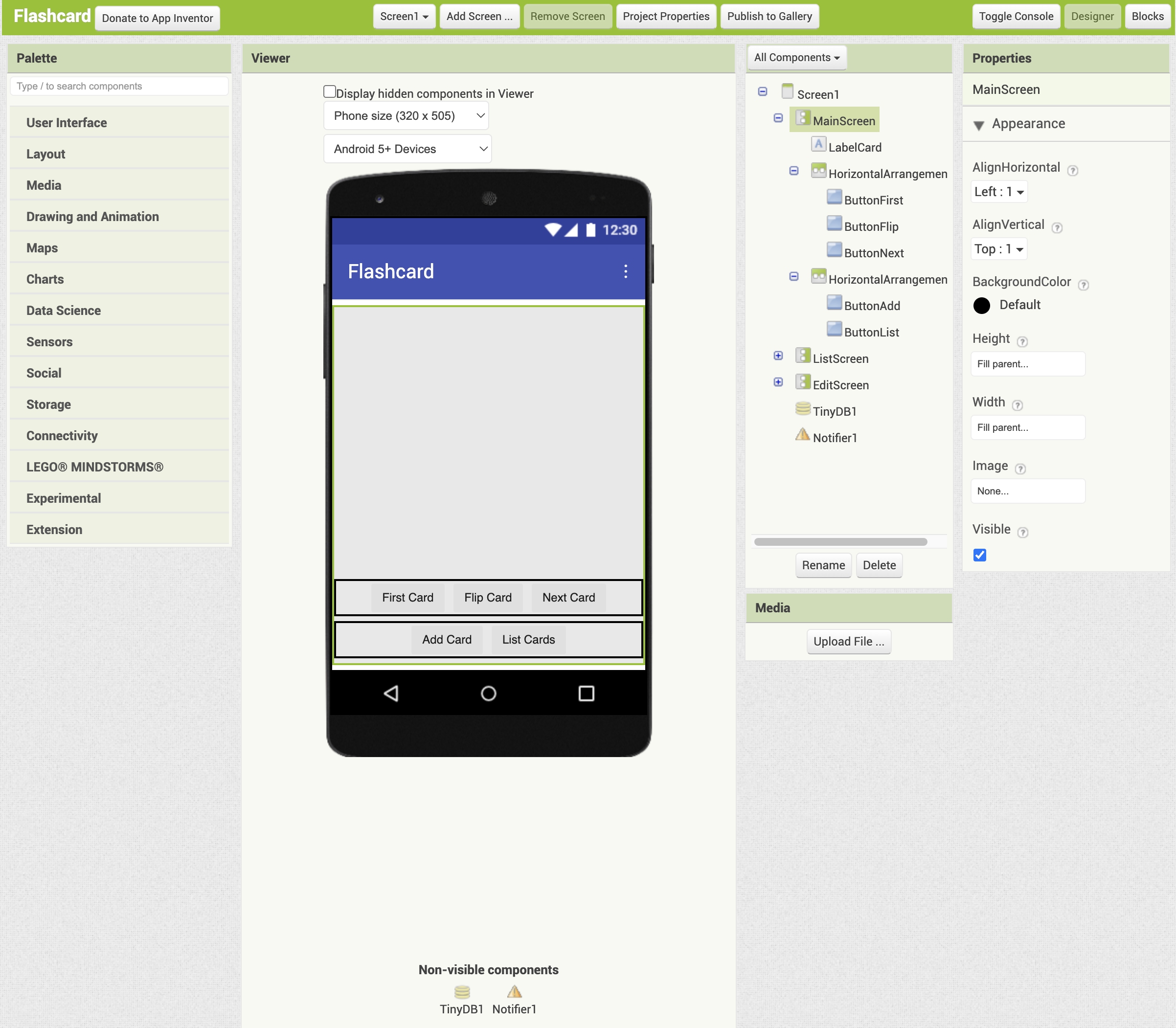 - Inside HorizontalArrangement1, add three Buttons from the User Interface palette. From left to right, name them ButtonFirst, ButtonFlip, and ButtonNext, and set their text to “First Card", “Flip Card", and “Next Card", respectively.