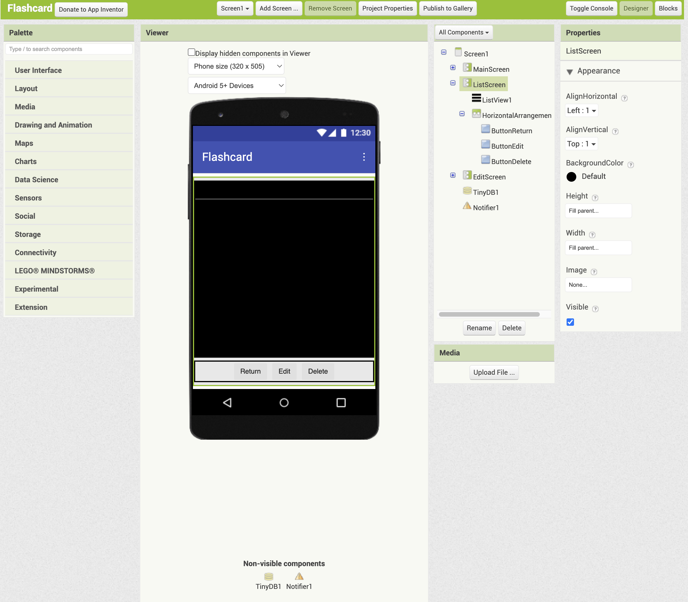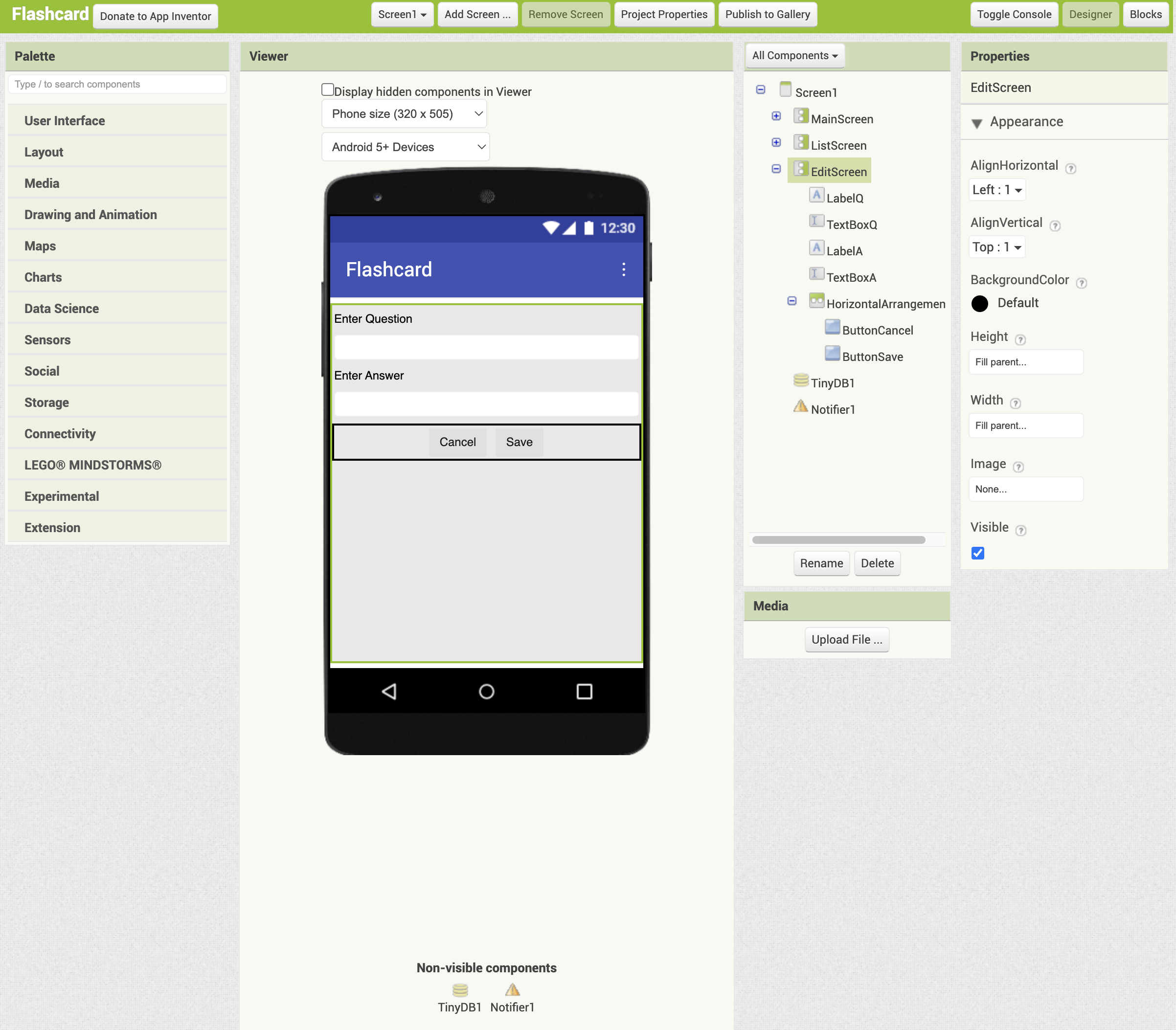 As non-visible components, add one Notifier (Notifier1) from the User Interface palette, and one TinyDB (TinyDB1) from the Storage palette.
